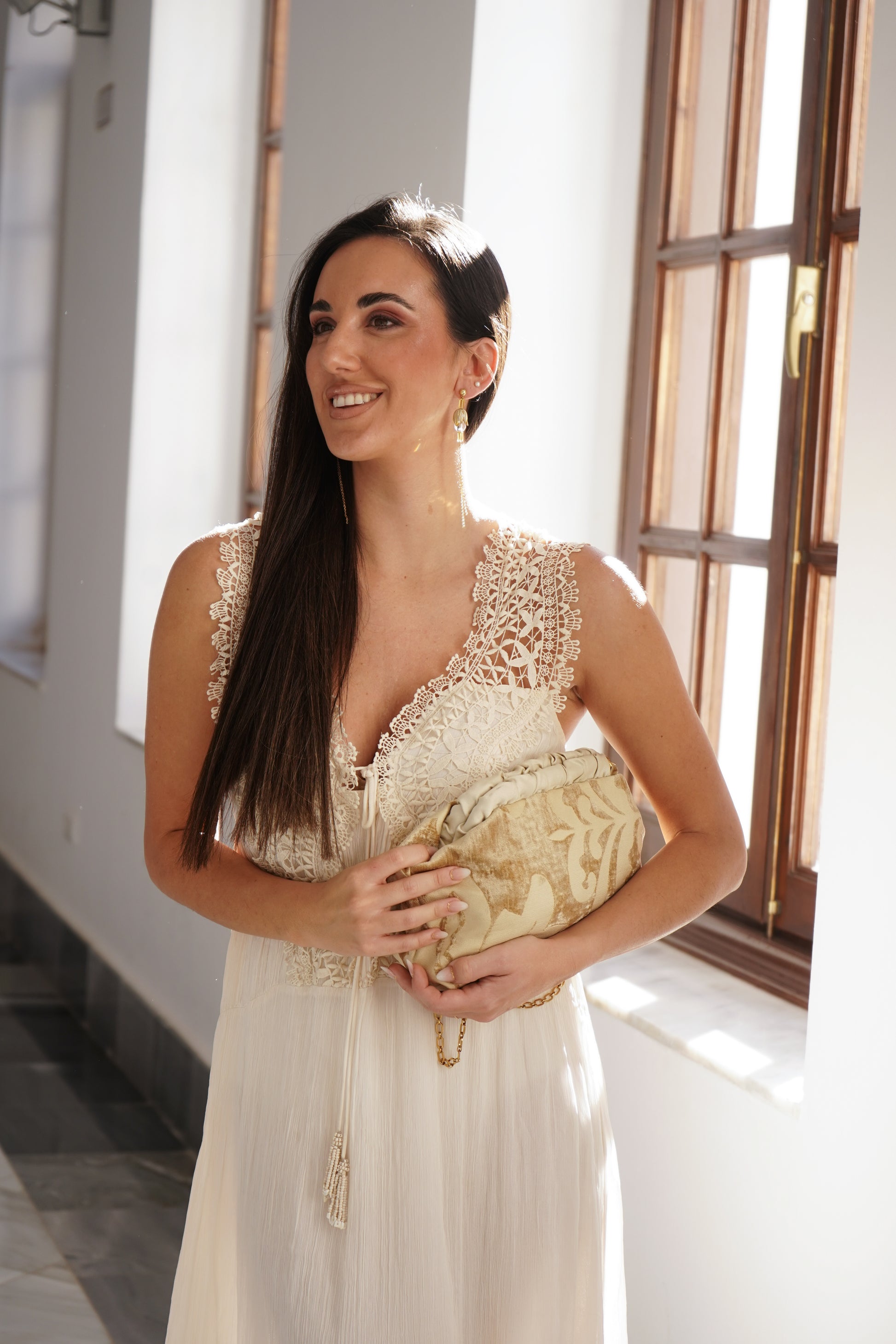 Bolso de mano hecho en Terciopelo estampado color champagne. Viene con una cadena de quita y pon para que lo puedas llevar colgado a diferentes alturas. La cadena es de metal en color dorado.