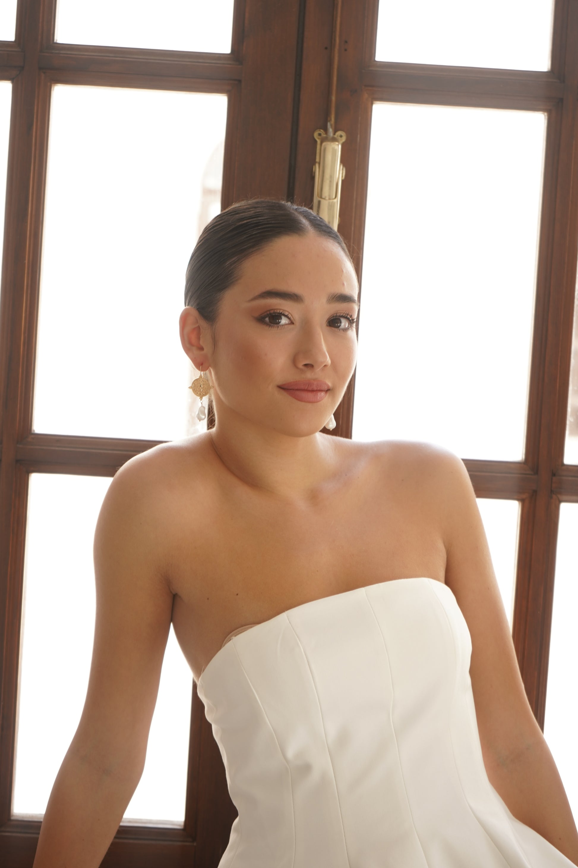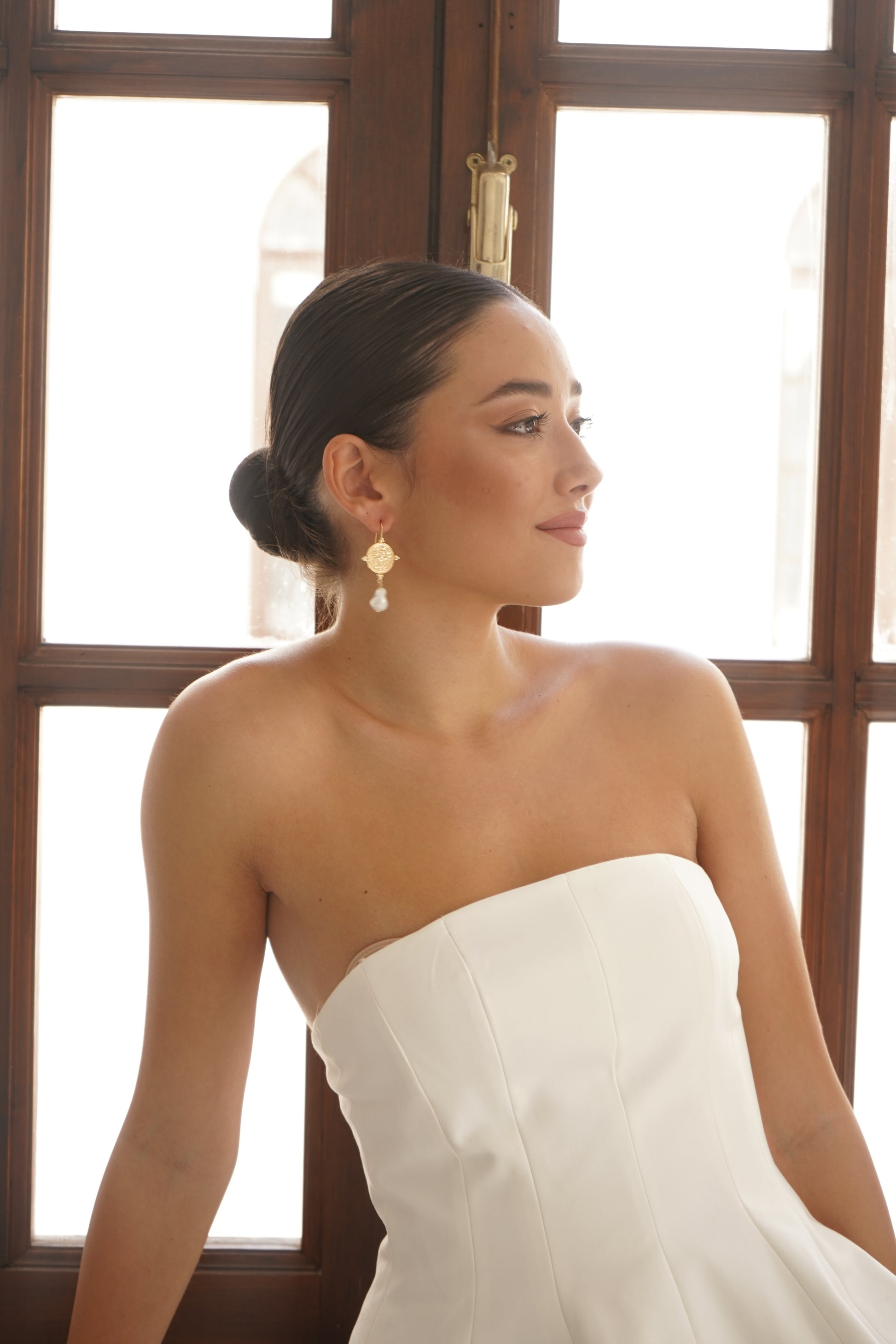 Pendientes largos de estilo medallón dorado con perla blanca, una pieza elegante y atemporal que aporta luz y sofisticación al rostro. El diseño combina un disco grabado estilo moneda antigua en acabado oro, con delicados relieves de inspiración clásica, y una madre perla irregular colgante que añade movimiento y un toque orgánico muy favorecedor.