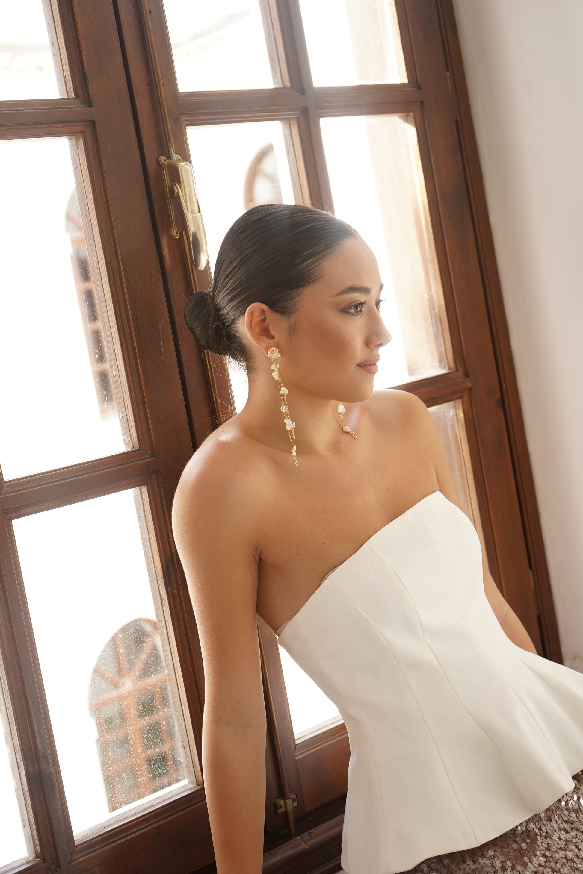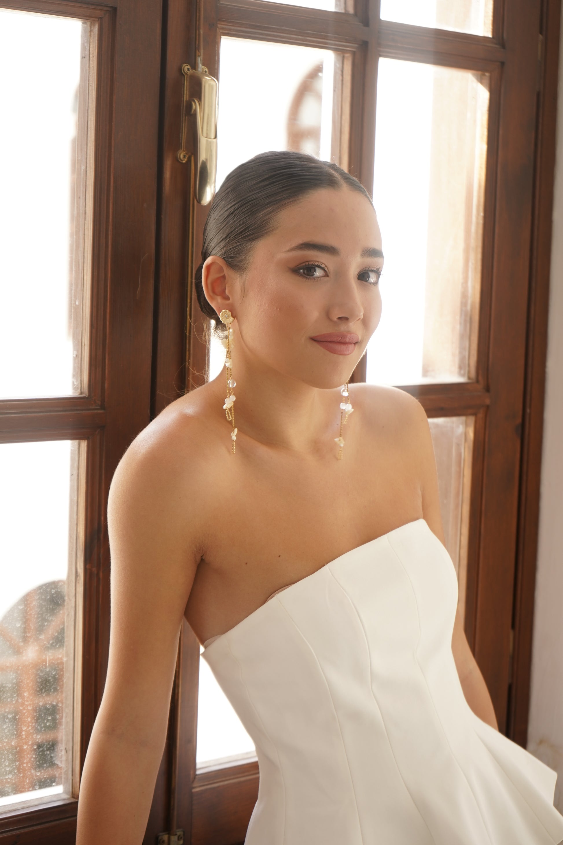 Un pendiente estilizado y favorecedor, ideal para invitadas, eventos especiales o para elevar un look sencillo con un detalle elegante y cuidado.